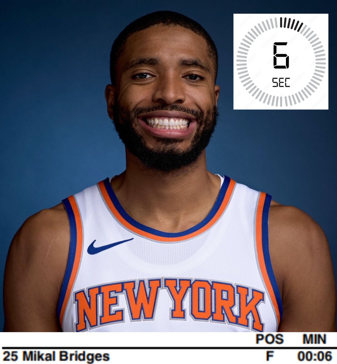 赛前,尼克斯媒体New York Basketball更新社媒:“最后一场比赛,尼克斯队首发阵容中只有一名球员可以出战,他就是米卡尔-布里奇斯……去年,布里奇斯在最后一场比赛中只打了6秒钟,就保持了他的“铁人”纪录。”