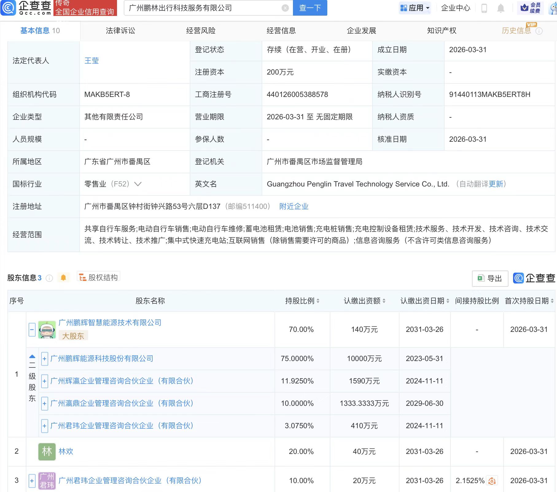 近日,广州鹏林出行科技服务有限公司成立,经营范围包含:共享自行车服务;电动自行车销售;电动自行车维修;蓄电池租赁等。企查查股权穿透显示,该公司由鹏辉能源(300438)旗下广州鹏辉智慧能源技术有限公司等共同持股。